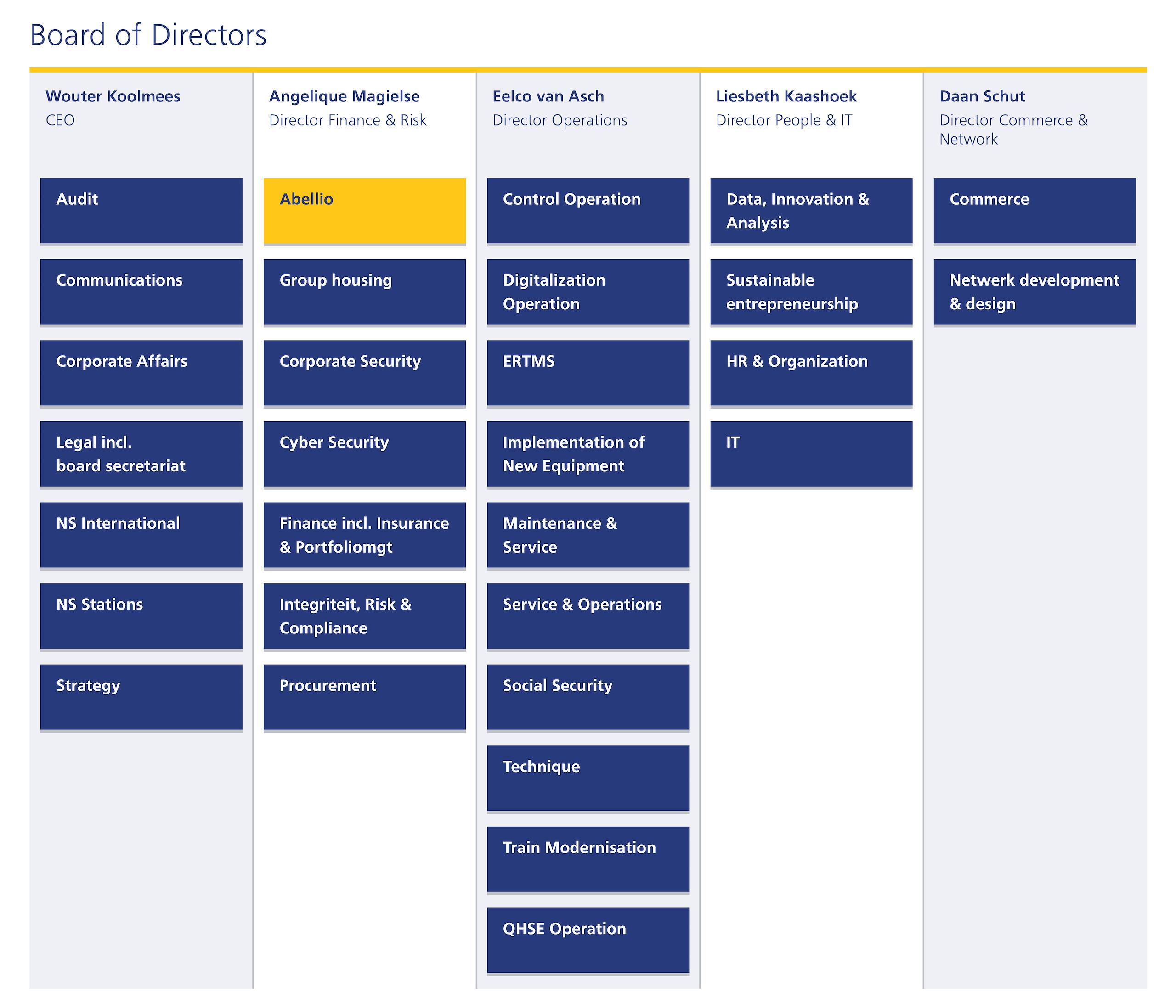 NV Nederlandse Spoorwegen (NS) is a public limited company under Dutch law. Its registered office is in Utrecht. NS is a state-owned company with the Dutch state as its sole shareholder. The role of company shareholder is performed by the Ministry of Finance. NS is the holding company of NS Groep N.V. NS has a two-tier governance structure with an Executive Board and a Supervisory Board. The Executive Boards of NS Groep N.V. and NS consist of the same people (a personal union). The Supervisory Board oversees the Executive Board.