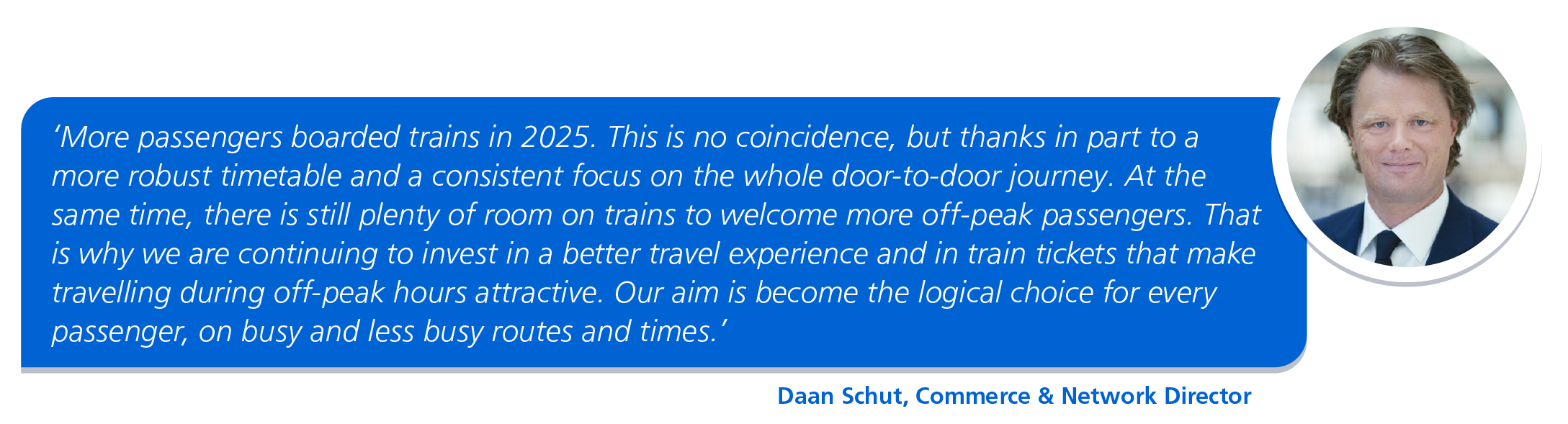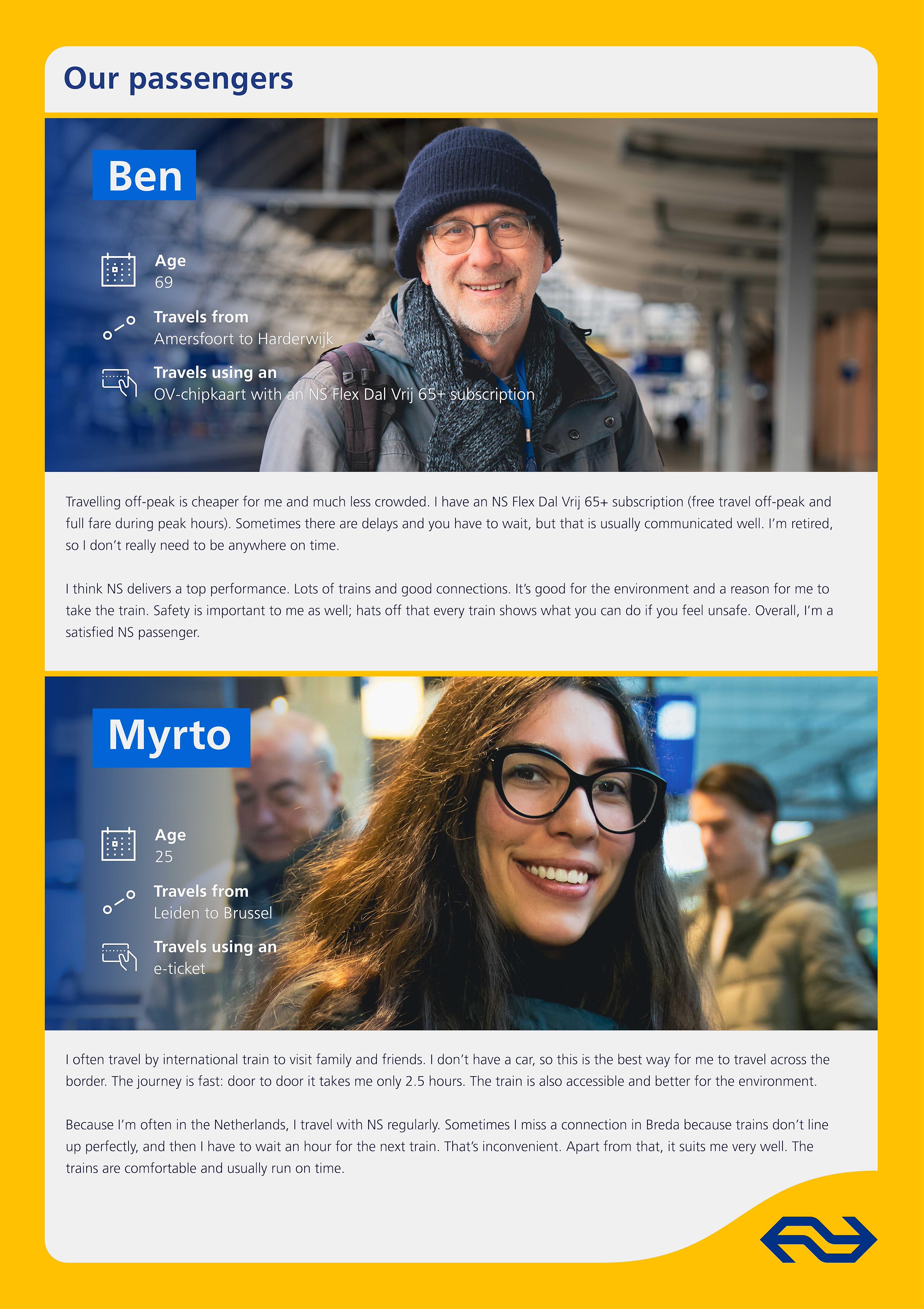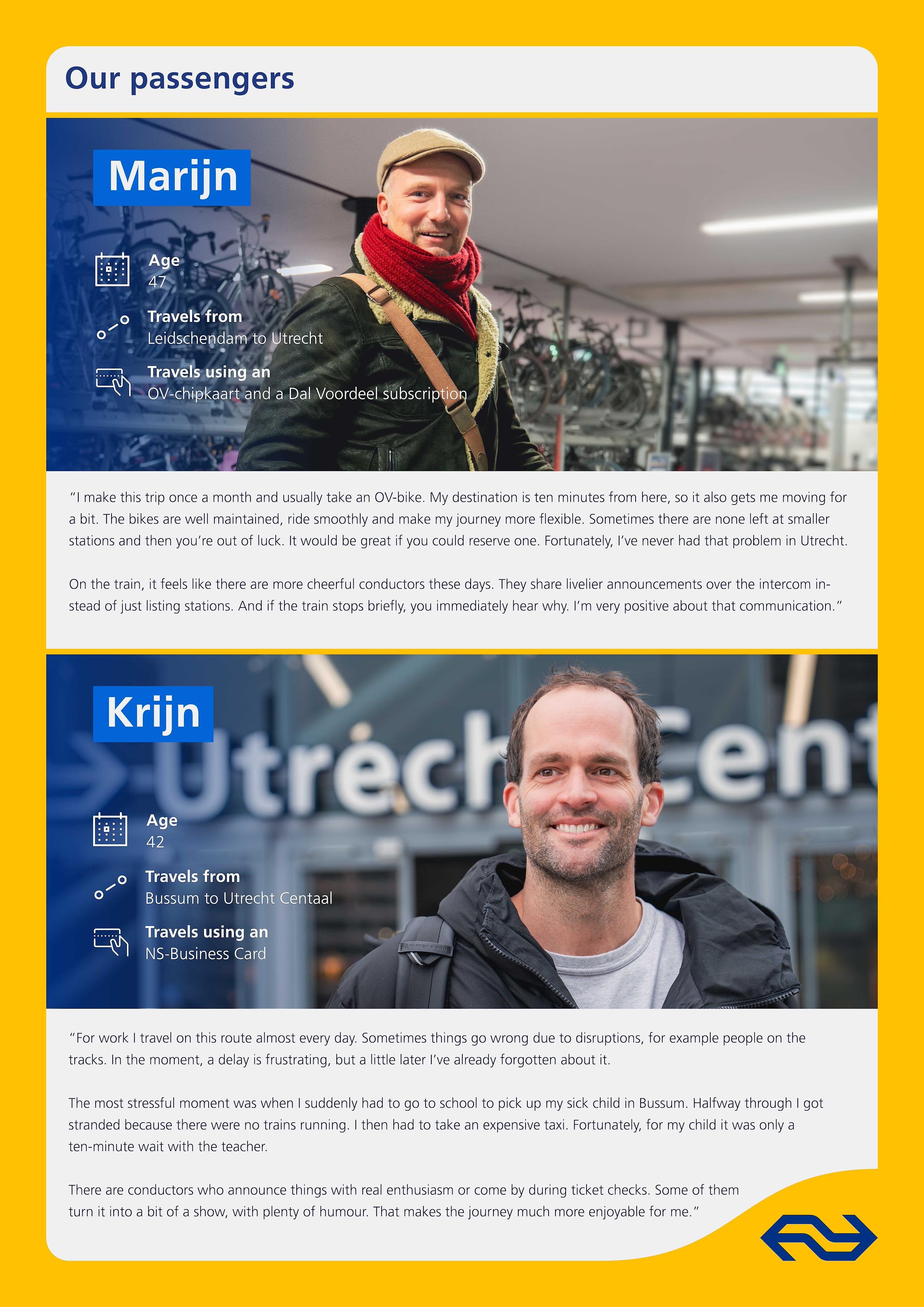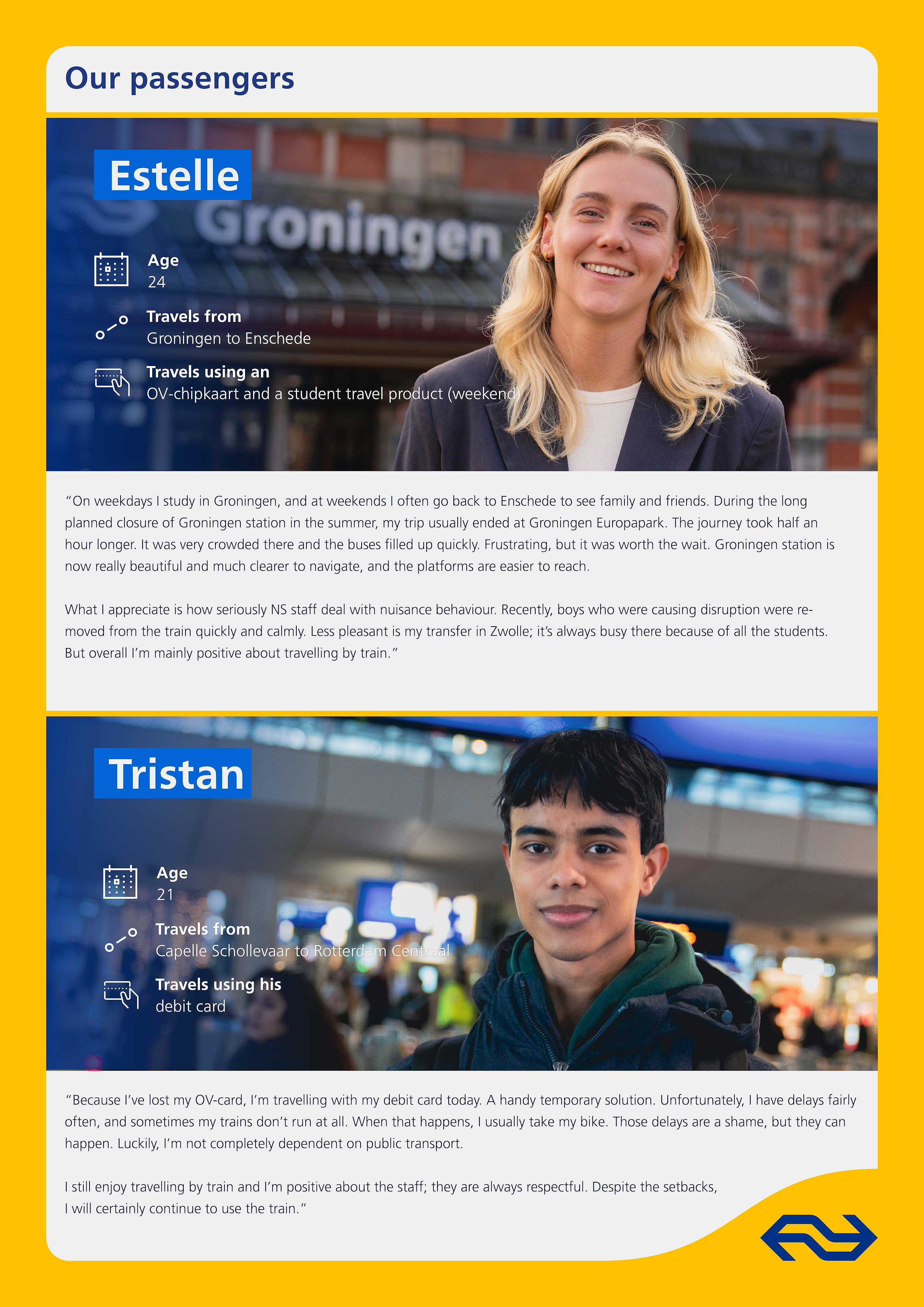 We are happy with them. And they are often happy with us, but sometimes not. Because not every journey goes as planned. That is why we are constantly monitoring our passenger experience. We asked six passengers to look back on their year with NS. You can read their stories on the following pages.