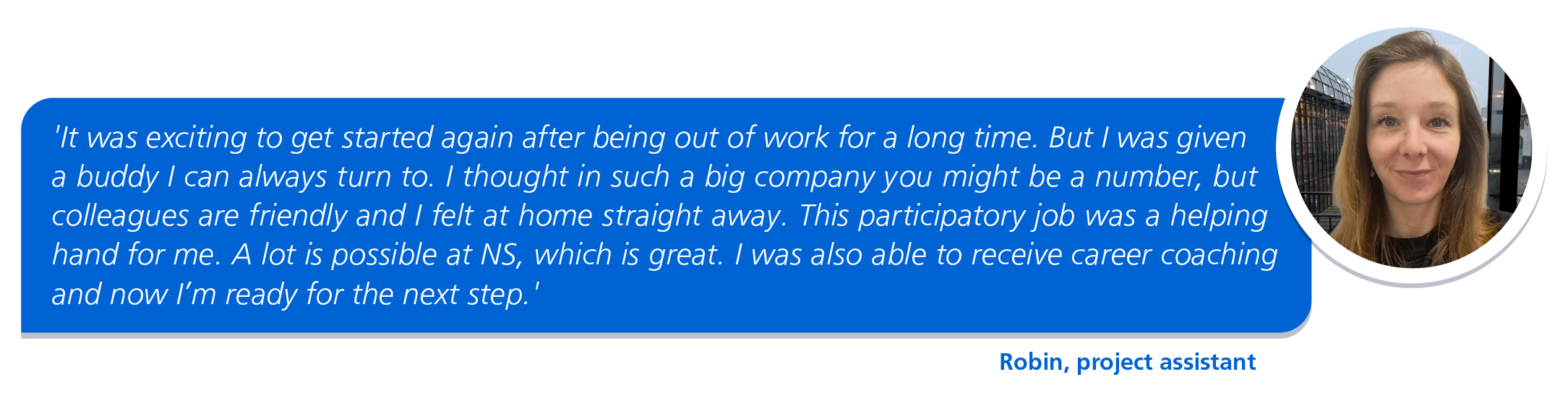 One of our goals is to create 200 participatory jobs for people with disabilities. In 2025, NS had 138 employees with an occupational disability in what are known as participatory jobs (2024: 165). Of these employees, 128 were still in employment at the end of December (year-end 2024: 151). Due to the tight labour market, staff with disabilities are difficult to recruit. We train internal employees and managers in mentoring colleagues with an occupational disability. We also offer various forms of support, such as career guidance, job coaching, workshops and training. This allows these colleagues to further shape their careers inside or outside NS and improve their job prospects.