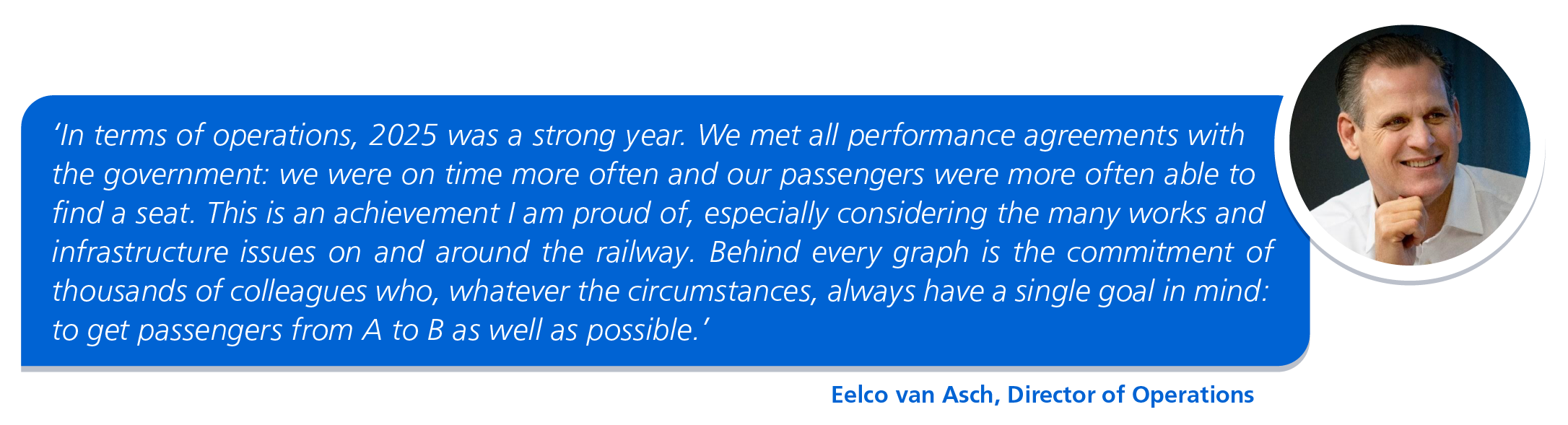 The 'Our operations' section explains how we conducted our day-to-day operations in 2025. We start by describing our concession indicators, which include punctuality, seat availability, crowded trains and travel information. We then go on to discuss influencing factors and the measures we took to deal with them. In this section, we also focus on our trains, safe travel and work, rail safety, public safety, cyber and physical security, accessibility and our efforts in relation to customer service and webcare.