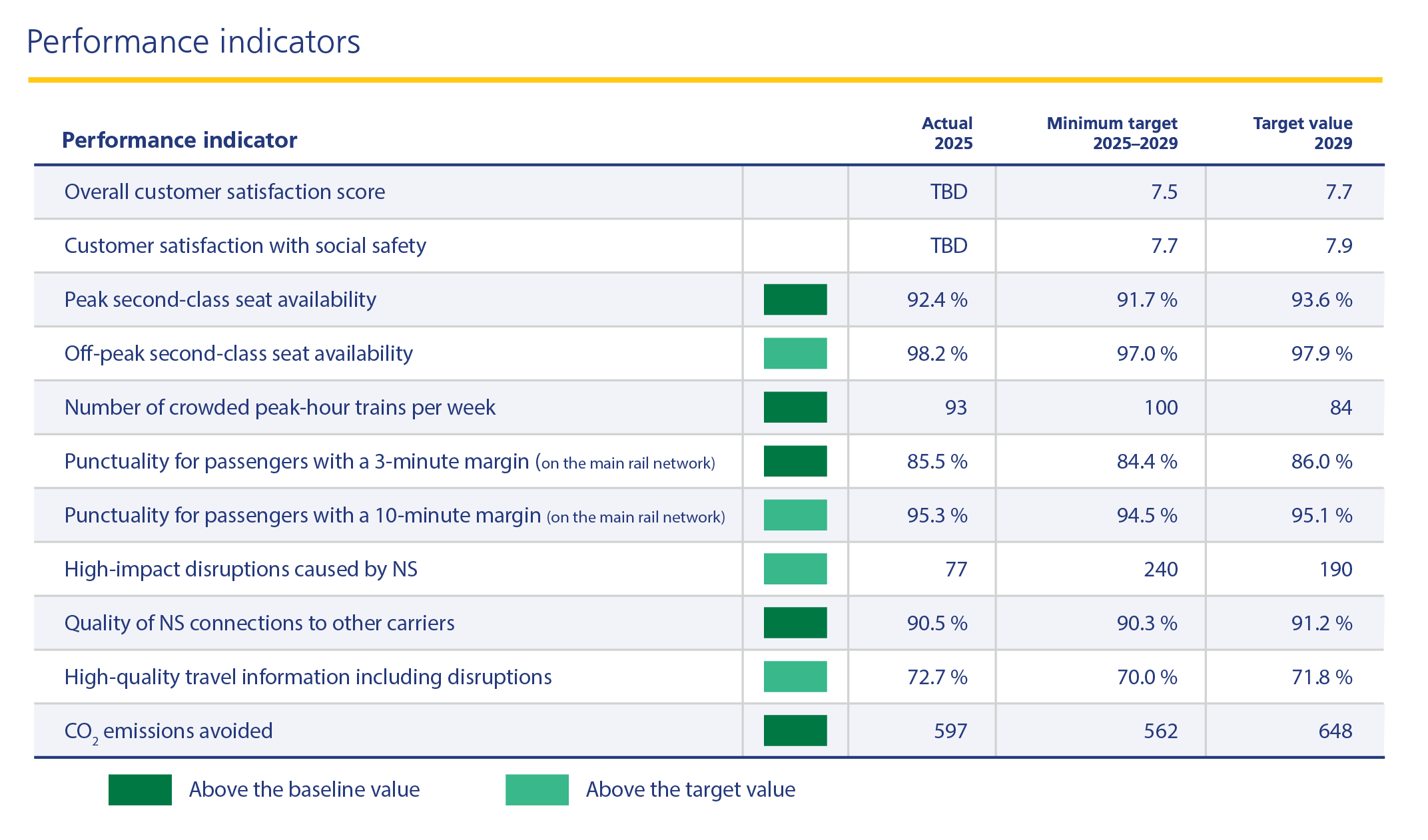 Our passengers often tell us directly what they think of what we do, and our performance is also in society’s spotlight. Of course we also have performance indicators (PIs) that we are required to meet. These PIs are agreed with the Ministry of Infrastructure and Water Management and set out in the main rail network transport concession for the period 2025-2033. We have now completed the first year of this new concession. New PIs have also been agreed for this concession. The overall customer satisfaction score and the customer satisfaction score for public safety are not yet known. We have met all other PIs.