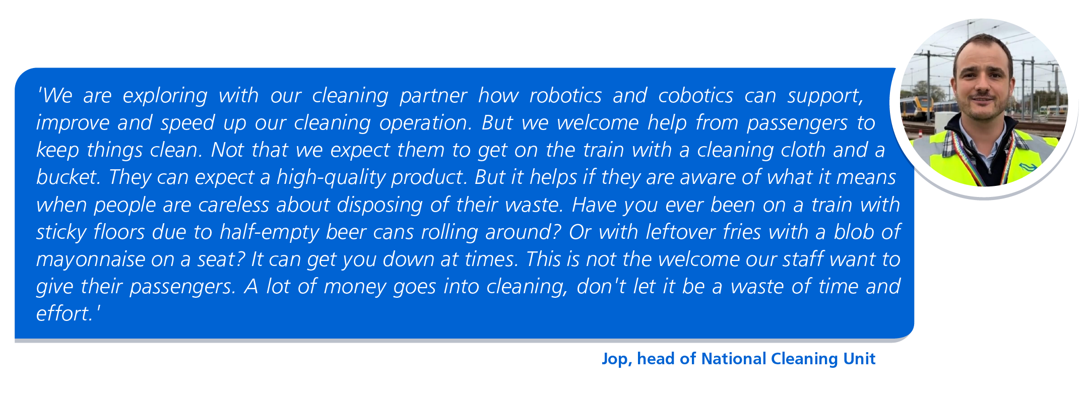 A clean train is an advert for NS. And cleaning helps ensure that the train reaches the end of its service life. Not to forget, whether trains are clean or not affects customer satisfaction.