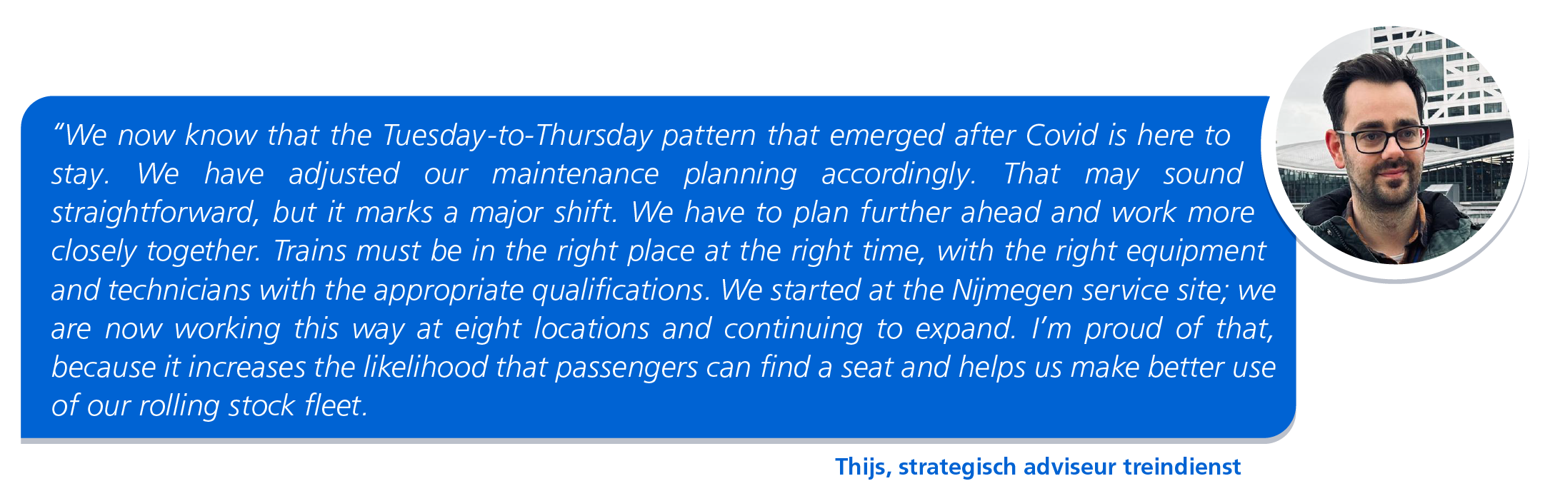Train maintenance is an ongoing process. It is a precarious balance between when trains are needed in the timetable and when we need to maintain them. Another complication is 'super-peak hours': extreme rush hour traffic on Tuesdays and Thursdays. Ideally, we would like to deploy all the rolling stock in the timetable at these times. So we started planning smarter, spreading maintenance differently throughout the week. For instance, we do less maintenance on Tuesdays and Thursdays and more on the other days. That also means we make choices when it comes to repairs: if safety is not at risk, sometimes a train is repaired a little later. But, for example, if an air conditioner stops working during a hot period it will be dealt with immediately on Tuesday or Thursday. In 2025, NS withdrew an average of 13% of its trains each day for maintenance, repairs and refurbishment. This meant the average withdrawal was 2% lower than in 2024.