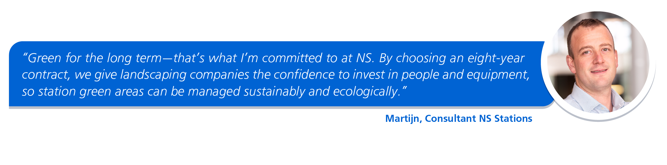 By adopting green business practices we contribute to biodiversity, a healthy environment, combating climate change, and climate adaptation. Together with ProRail and municipalities, we are ensuring that there is more, and more biodiverse, nature at our stations and workplaces. But we are also taking other steps, such as working on a larger vegetarian and vegan range in our shops and company canteens.